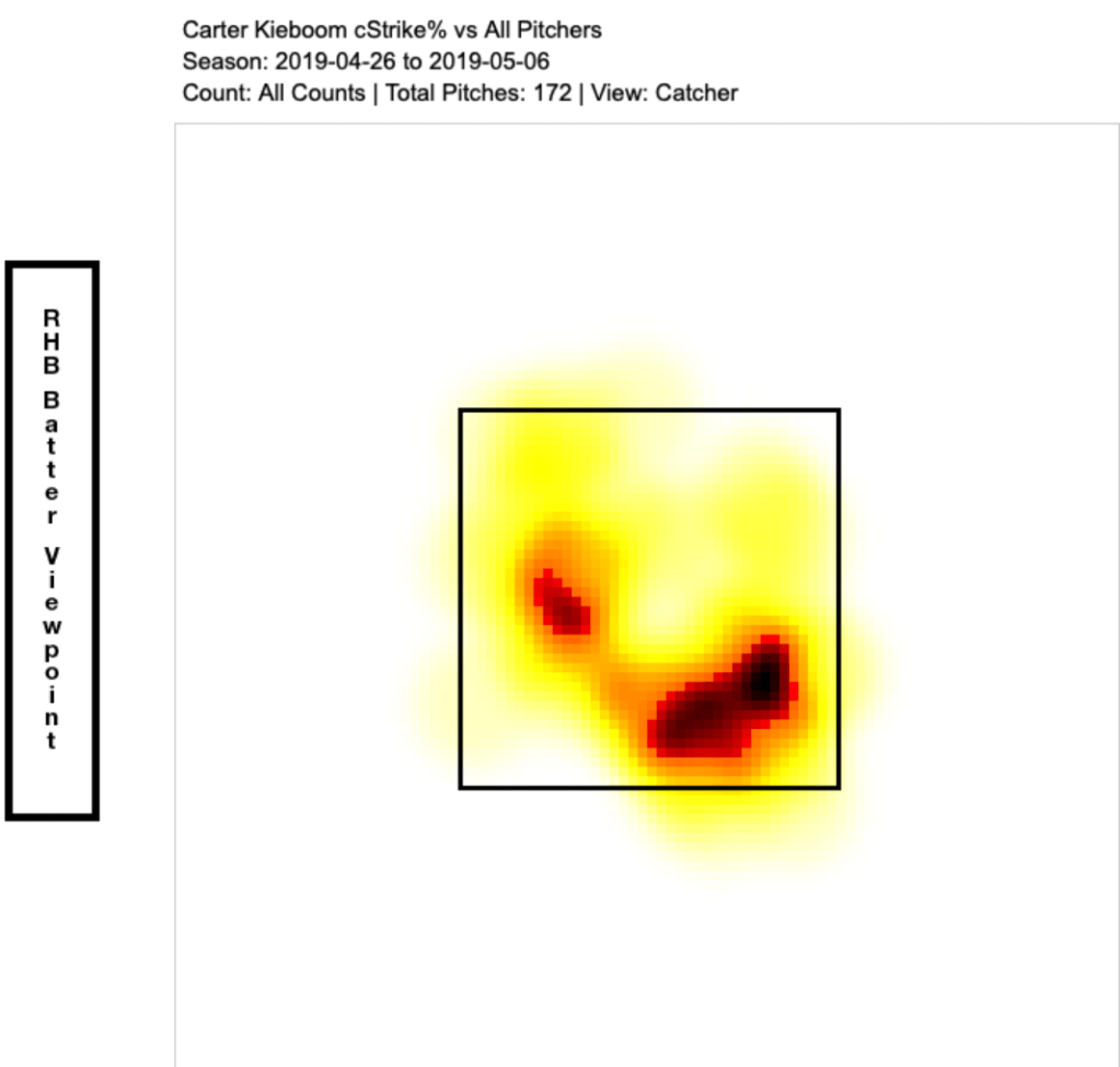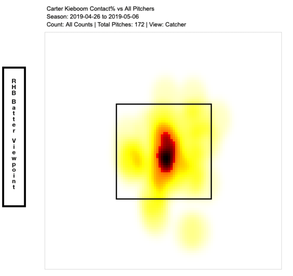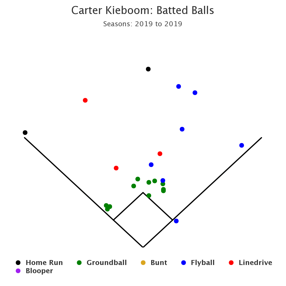 Interestingly enough, Kieboom finds the most success on a vertical plane, instead of a horizontal plane over the heart of the plate. Naturally, with less swings typically comes less contact, but optimism can be manufactured from the contact he does make. He can hit to all fields, something that can be predictive despite his small sample size with Washington last year. Kieboom pulled 26.1% of the contact he made, while an equivalent (!) 26.1% went to the opposite field, and 47.8% of his contact were hit towards center field. Furthermore, Kieboom’s limited contact was not particularly poor contact. Of all balls he put in play, Kieboom made “hard contact” (determined by Baseball Info Solutions) 43.5% of the time, surpassing the league average of 30%. His medium contact percentage of 47.8% is slightly below average, but deemed a positive when considering his infatuation for hard contact and an incredibly low 8.7% soft contact percentage. He struggled to make contact, but when he did, it was largely of quality and to all fields.