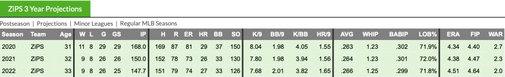 Despite my excitement, other methods of prediction are hesitant to share the hype. According to Fangraph’s ZiPS projection, Tanaka is set to plateau in his command, with a 1.98 BB/9. He’s projected for a 4.34 ERA and a 4.40 FIP, a mark that would be a career-worst. In a shortened season, it will be interesting to see how the projections hold up.