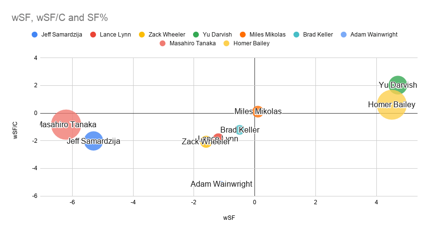 We start with the following chart (and corresponding table) that begins to show this correlation. While Tanaka’s tERA appears to be less reliant on his splitter’s effectiveness (wSF/C), there’s still a clear trend between this pitch value and its impact on other pitching metrics.