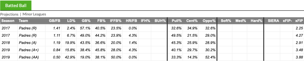 Furthermore, one of the most enticing aspects of his game come from his batted ball statistics. He’s clearly a fly ball pitcher, and that likely won’t change, but he’s been effective at limiting line drives. For someone that has had his struggles with command, his 4.3 HR/FB% at rookie ball and high-A are promising. Take into account his 1.4 HR/FB% at A ball and you’ll find an even more intriguing prospect.